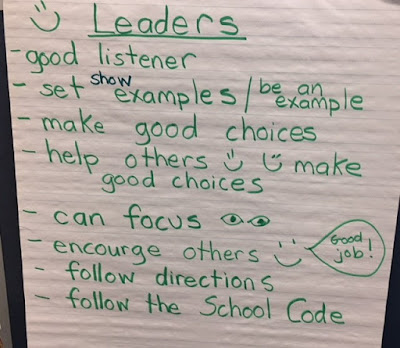 We launched our Leadership Campaign in our classroom this week. We had a class discussion about what leaders do/say/look like and we made a list (see attached). We're all trying to be leaders in our room. At the end of each day, we reflect on who was a leader and why. We count how many leaders we've had that day and we hope for more tomorrow!